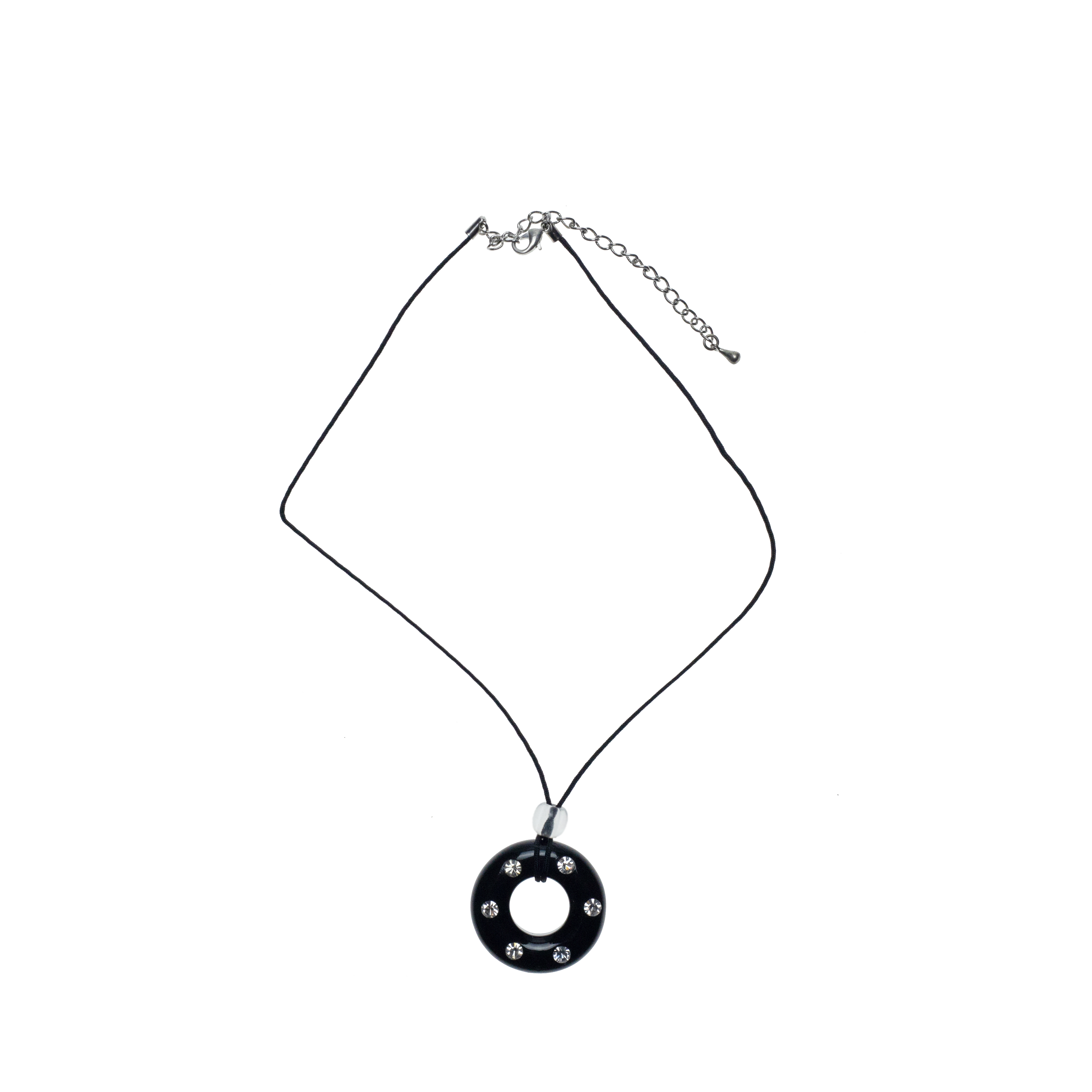 Κολιέ με μαύρο κορδόνι και στρόγγυλο μαύρο charm με λευκό strass και διάφανη πέτρα
