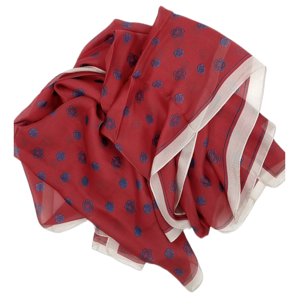 Κόκκινη τριανταφυλλί εσάρπα με μπλε λουλουδάκια και μπεζ μπορντούρα από σύμμεικτο μετάξι