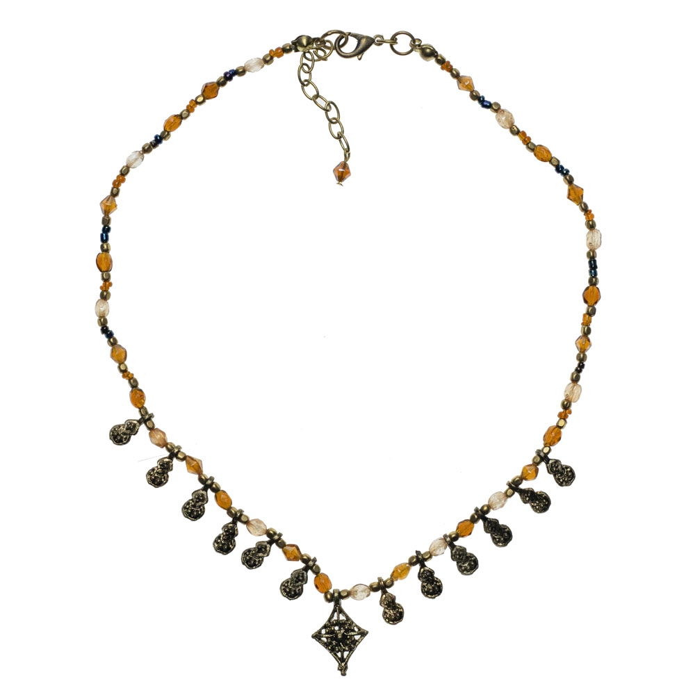 Kολιέ με καφέ, μελί και μπλε ιριδίζουσες πέτρες και antique χρυσαφί σκαλιστά charms