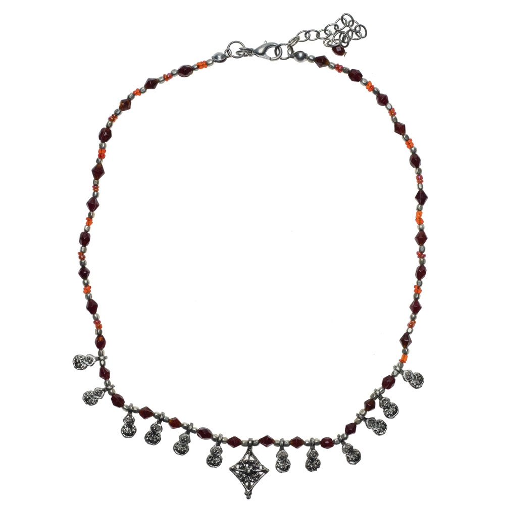 Kολιέ με μπορντό και κόκκινες πέτρες και antique ασημί σκαλιστά charms