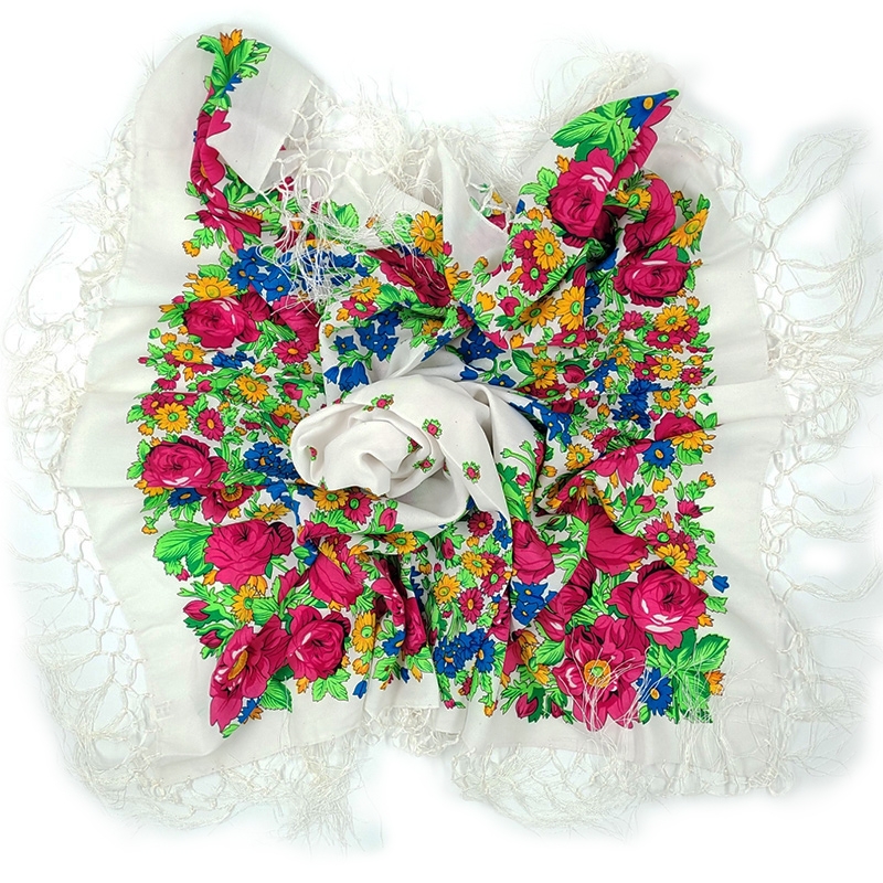 Λευκή παραδοσιακή μαντήλα με κόκκινα τριαντάφυλλα και κρόσσια