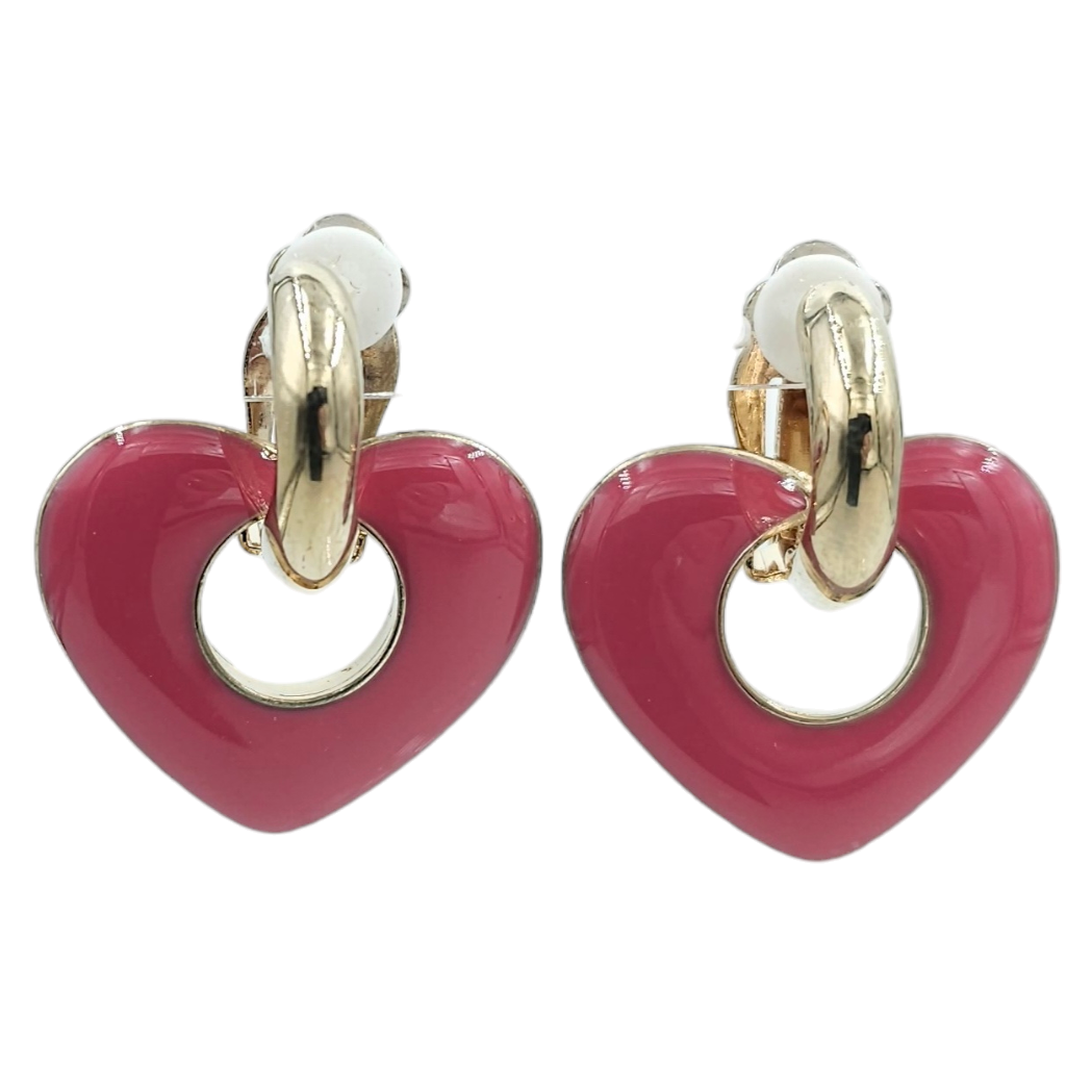 Χρυσαφί κλιπ σκουλαρίκια με κρεμαστές καρδιές από φούξια σμάλτο