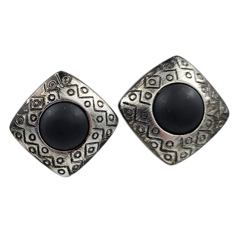 Antique ασημί σκαλιστά clip σκουλαρίκια ρόμβοι με μαύρες ματ χάντρες