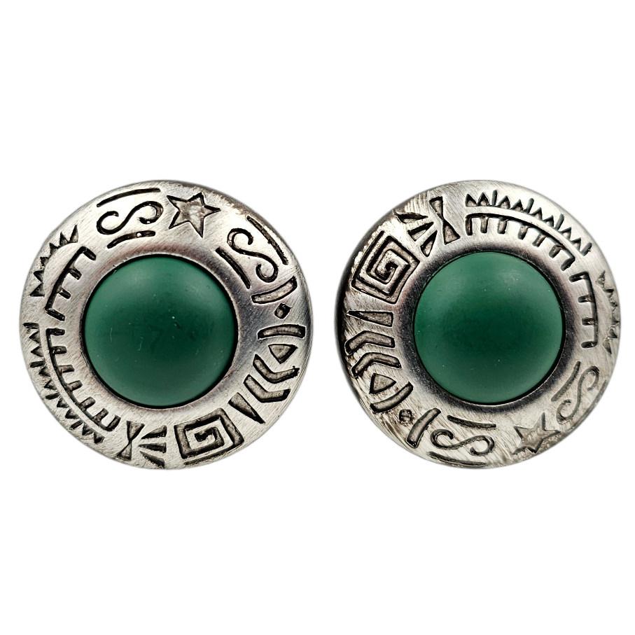 Antique ασημί σκαλιστά κυκλικά clip σκουλαρίκια με πράσινες ματ χάντρες