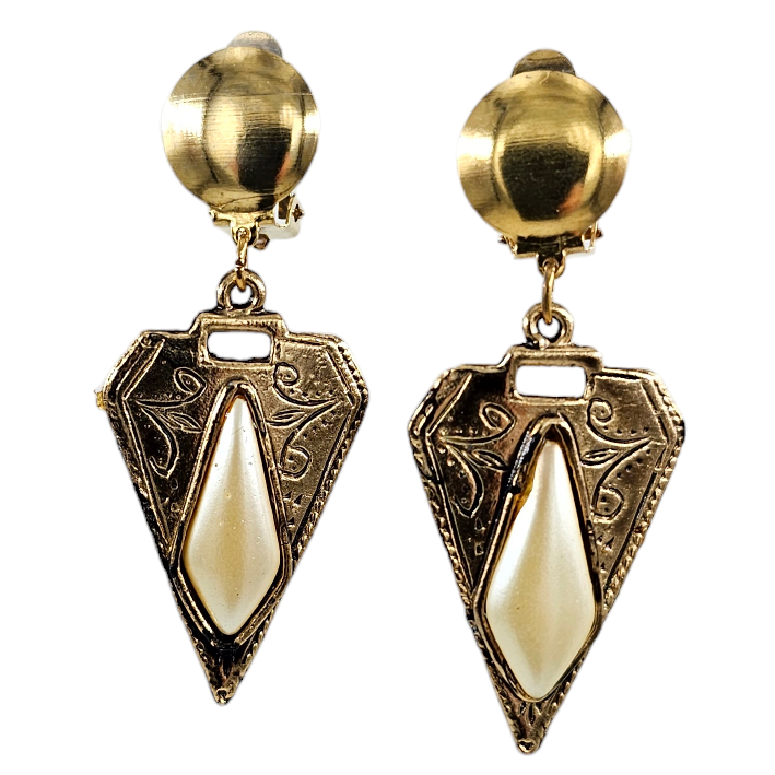 Antique χρυσαφί σκαλιστά τριγωνικά clip σκουλαρίκια με πολυγωνικές πέρλες