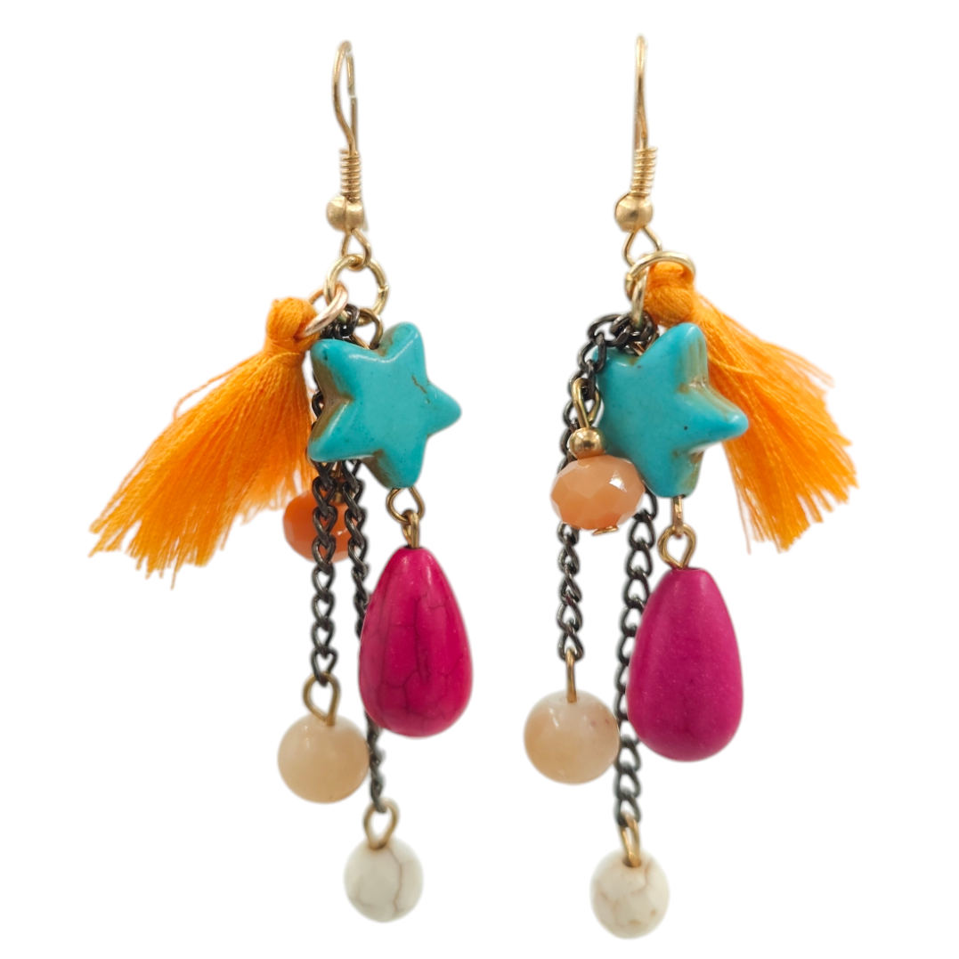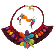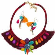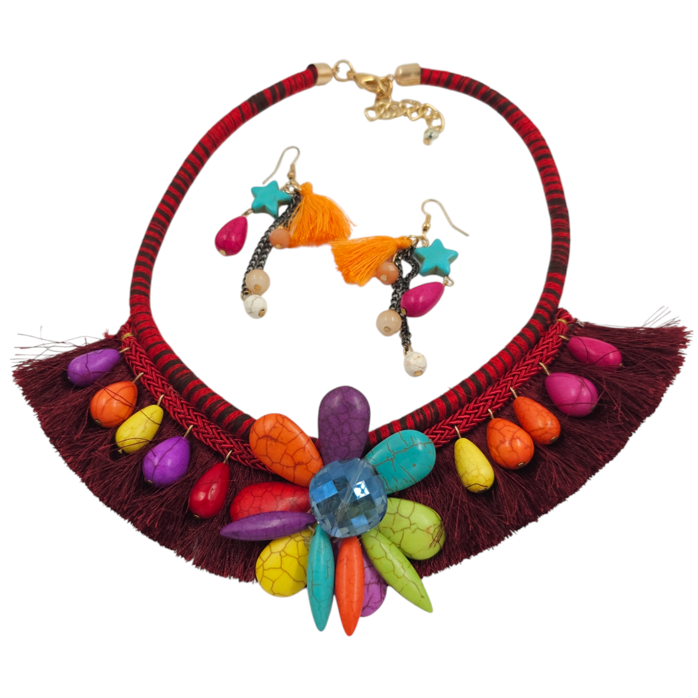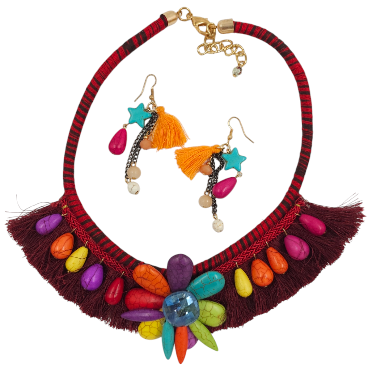 Boho μπορντό σετ κολιέ και σκουλαρίκια με χρωματιστές πέτρες, φούντες και κρύσταλλα