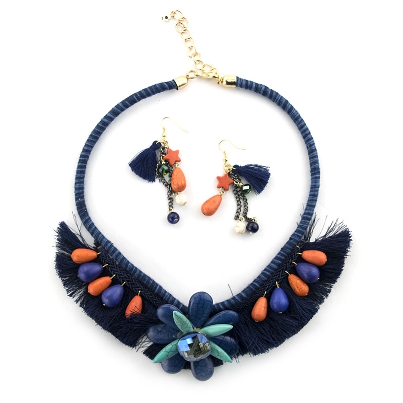 Boho μπλε και πορτοκαλί σετ κολιέ και σκουλαρίκια με πέτρες, φούντες και κρύσταλλα
