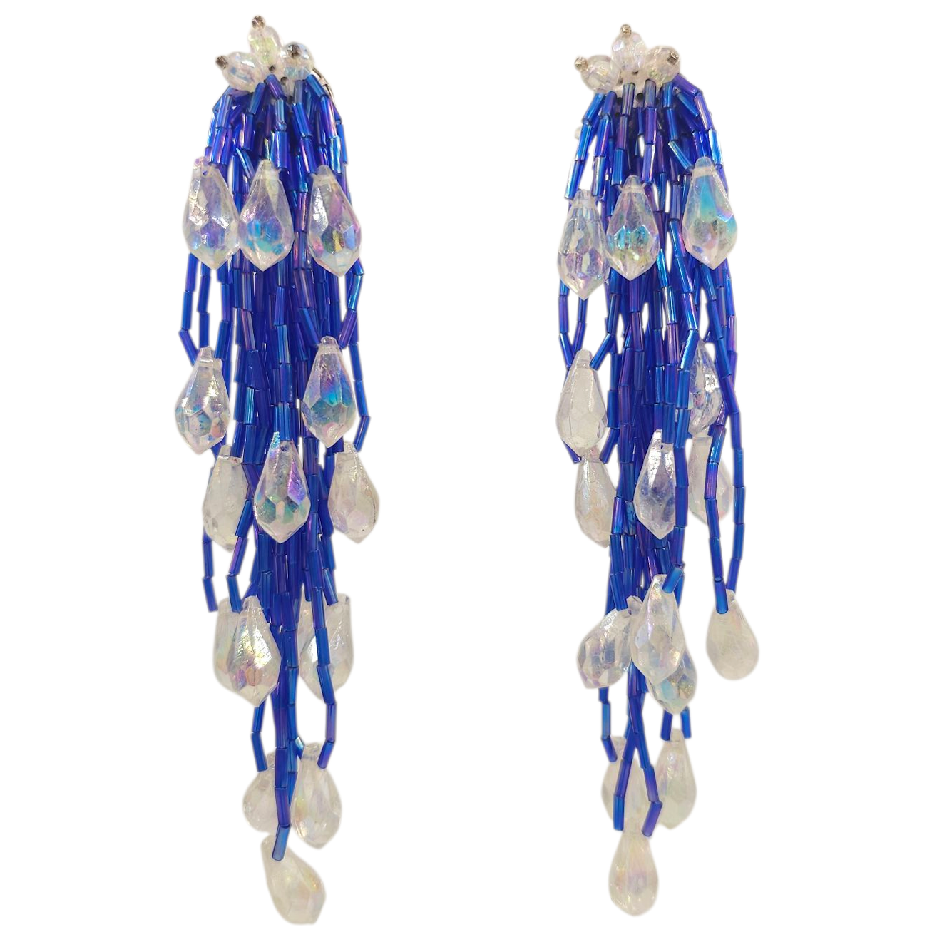 Μακριά clip σκουλαρίκια με μπλε royal χάντρες και διάφανα κρυσταλλάκια