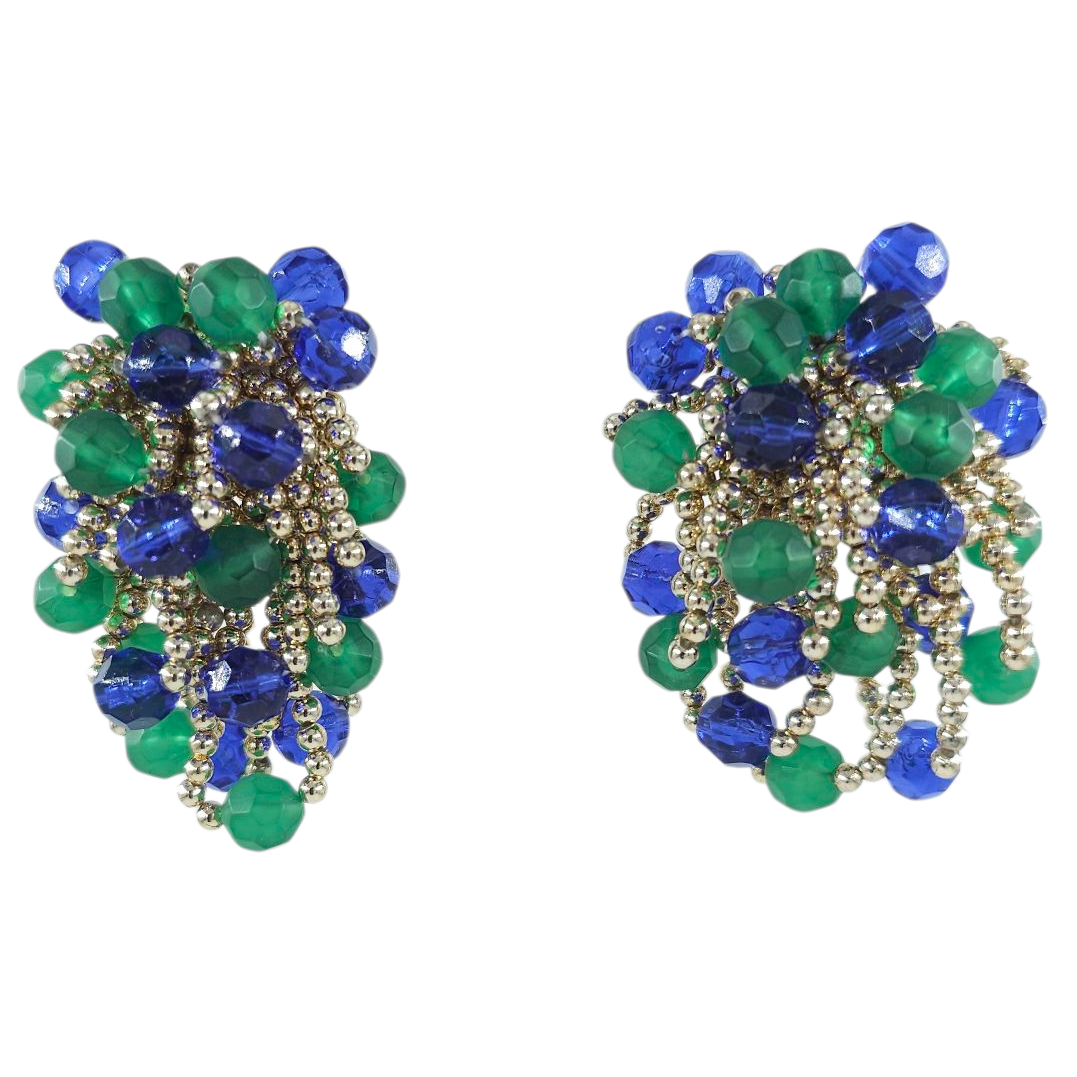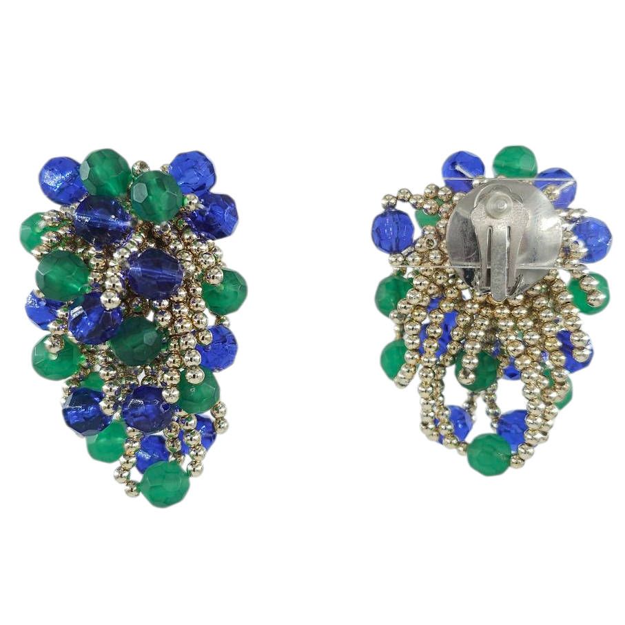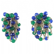 Fancy clip σκουλαρίκια με χρυσαφί dot αλυσίδες και royal μπλε - πράσινες πολυγωνικές χάντρες