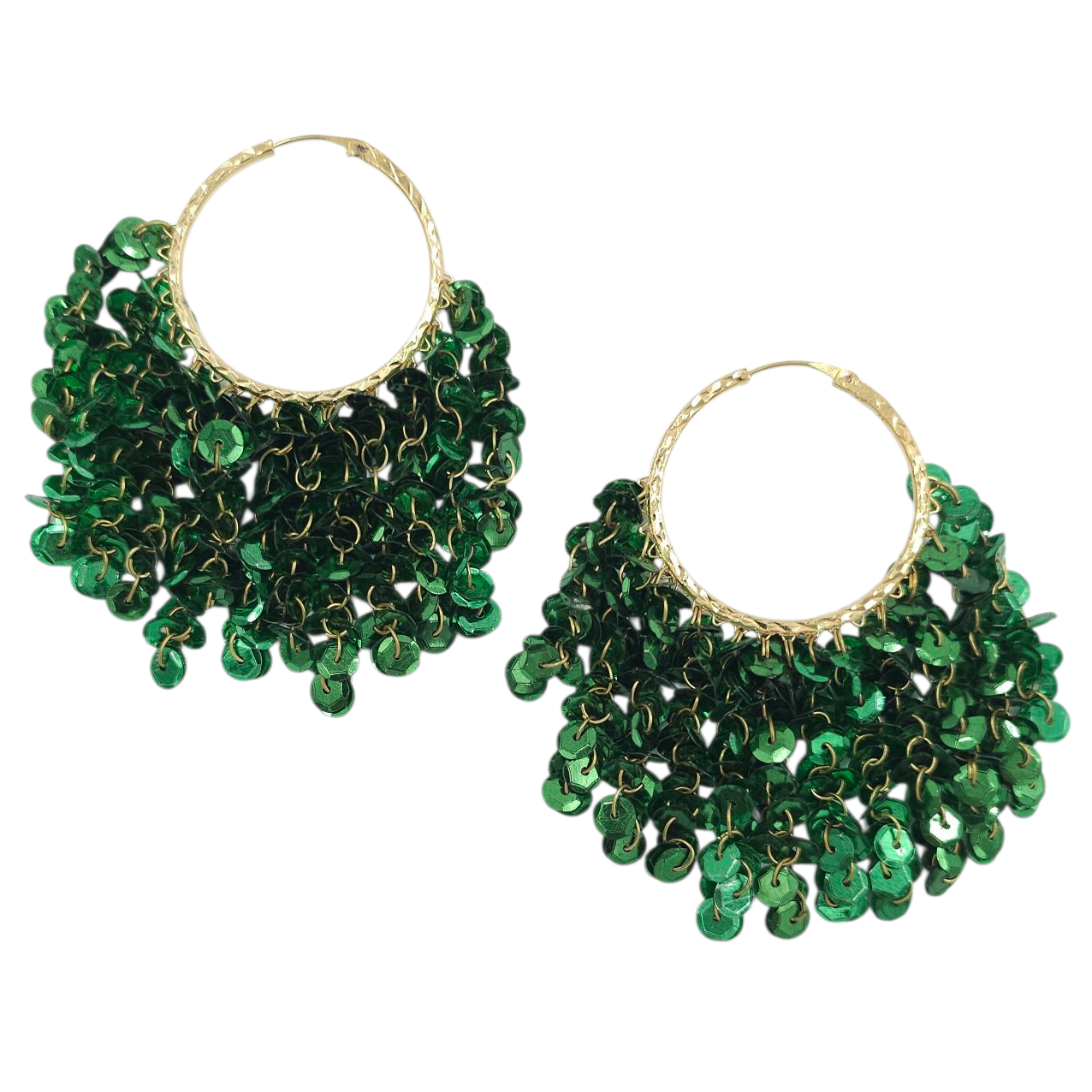 Χρυσαφί σφυρήλατοι κρίκοι με κρεμαστές raindrop πράσινες παγιέτες