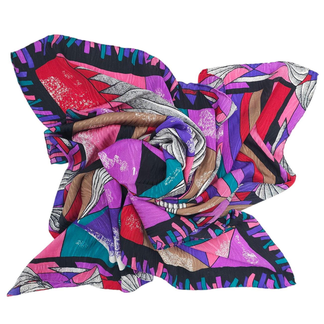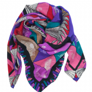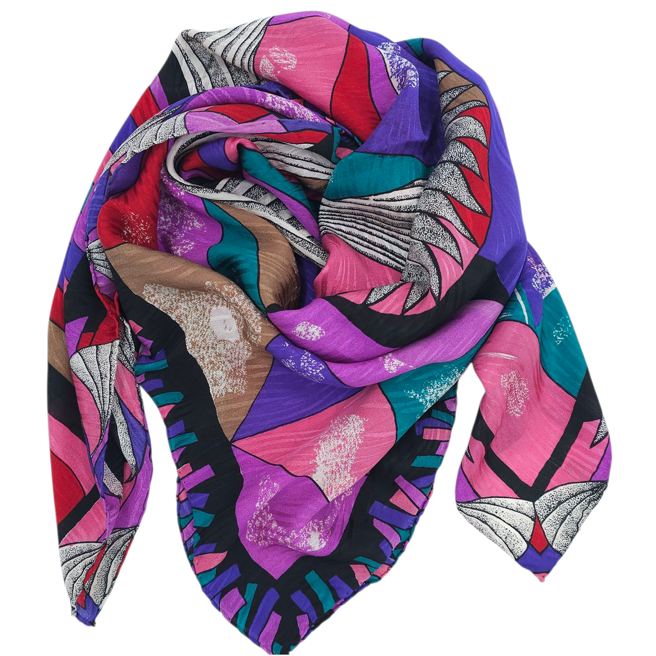 Μεταξωτή τετράγωνη μαντήλα Linear design με κόκκινα, μαύρα, ροζ, royal μπλε, μωβ και μπεζ σχέδια