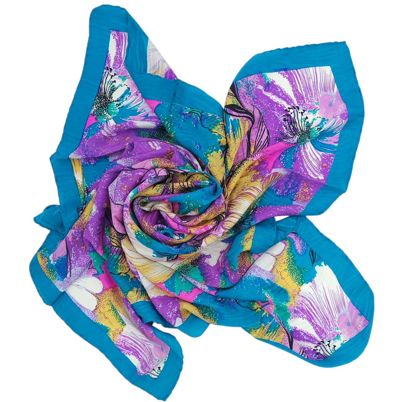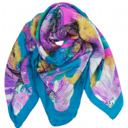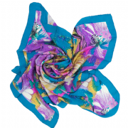 Μεταξωτή τετράγωνη μαντήλα με μεγάλα τιρκουάζ, λευκά, κίτρινα και μωβ λουλούδια