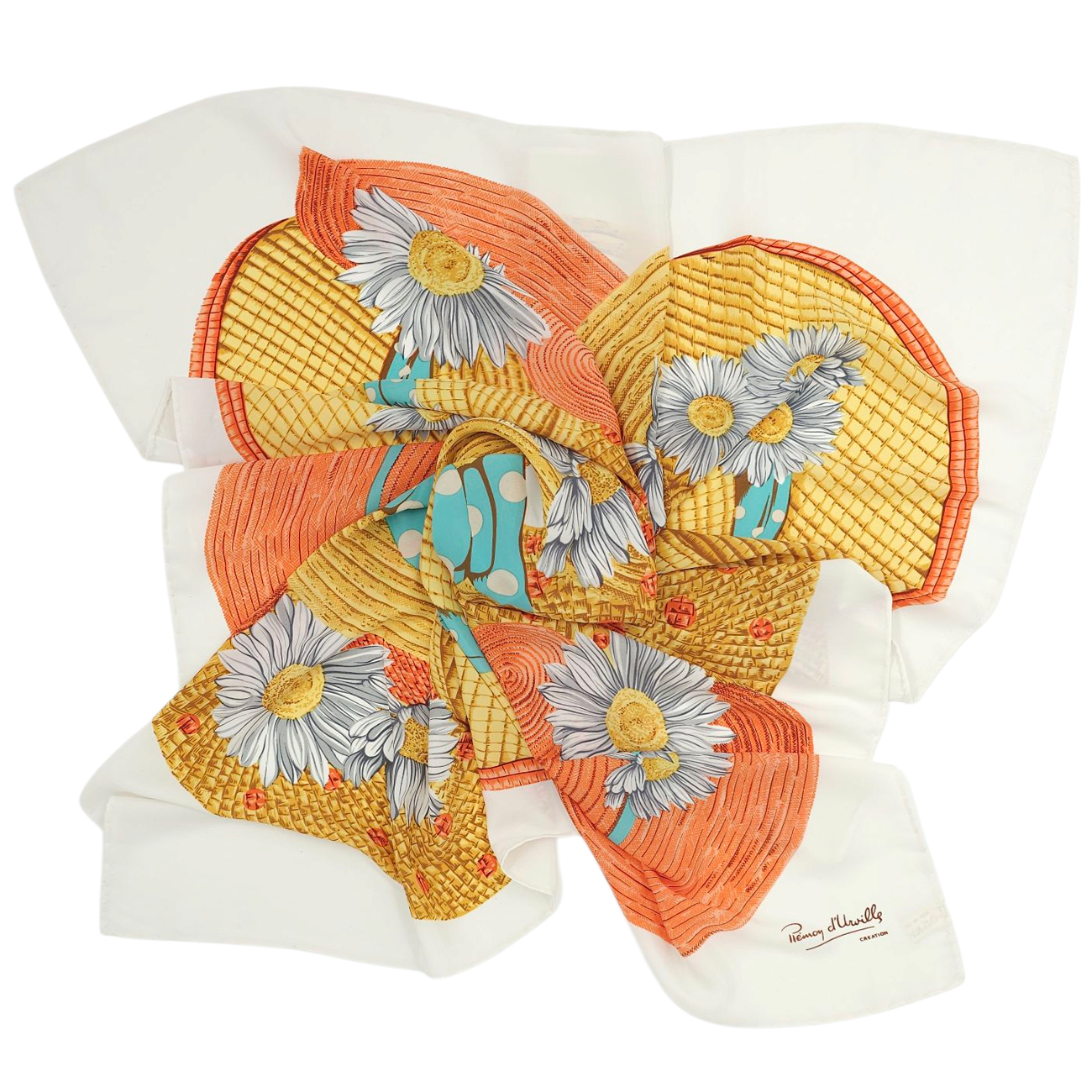 Λευκή μεταξωτή τετράγωνη μαντήλα με μεγάλα κίτρινα ψάθινα καπέλα και λευκά λουλούδια
